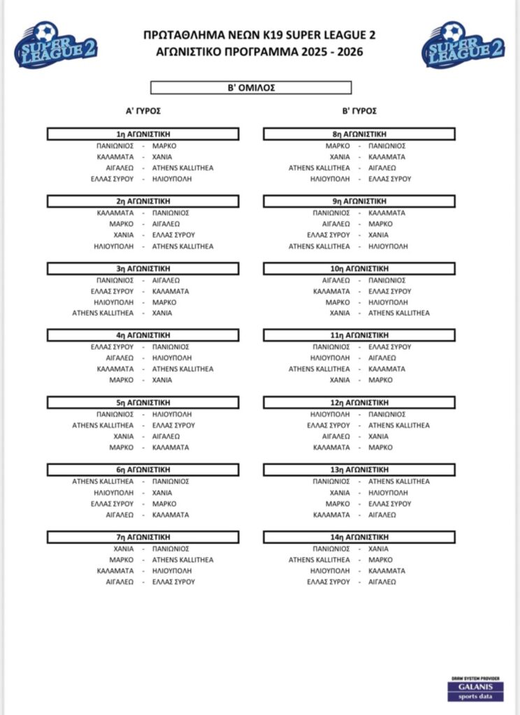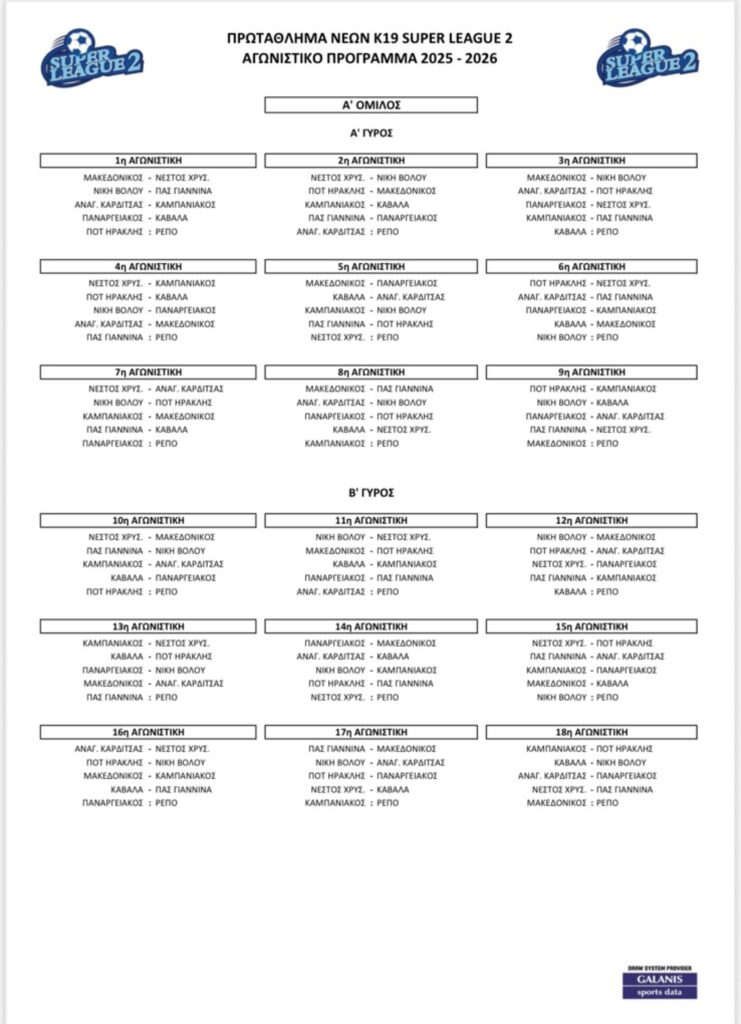 Το πρόγραμμα για το πρωτάθλημα Κ19 της Super League 2 2025-2026